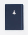 This elegant notebook features a space shuttle stamped in silver foil on a background of velvety blue.